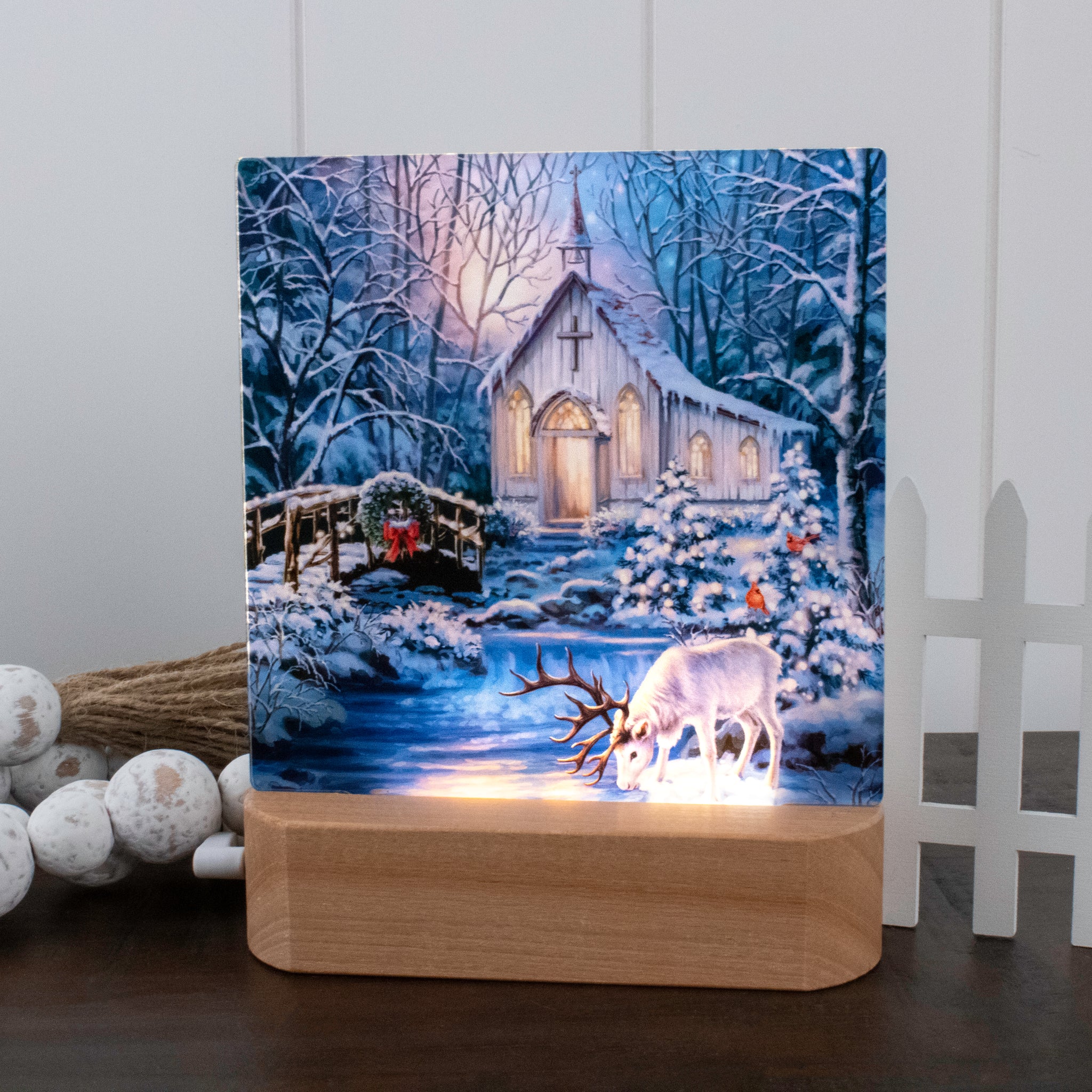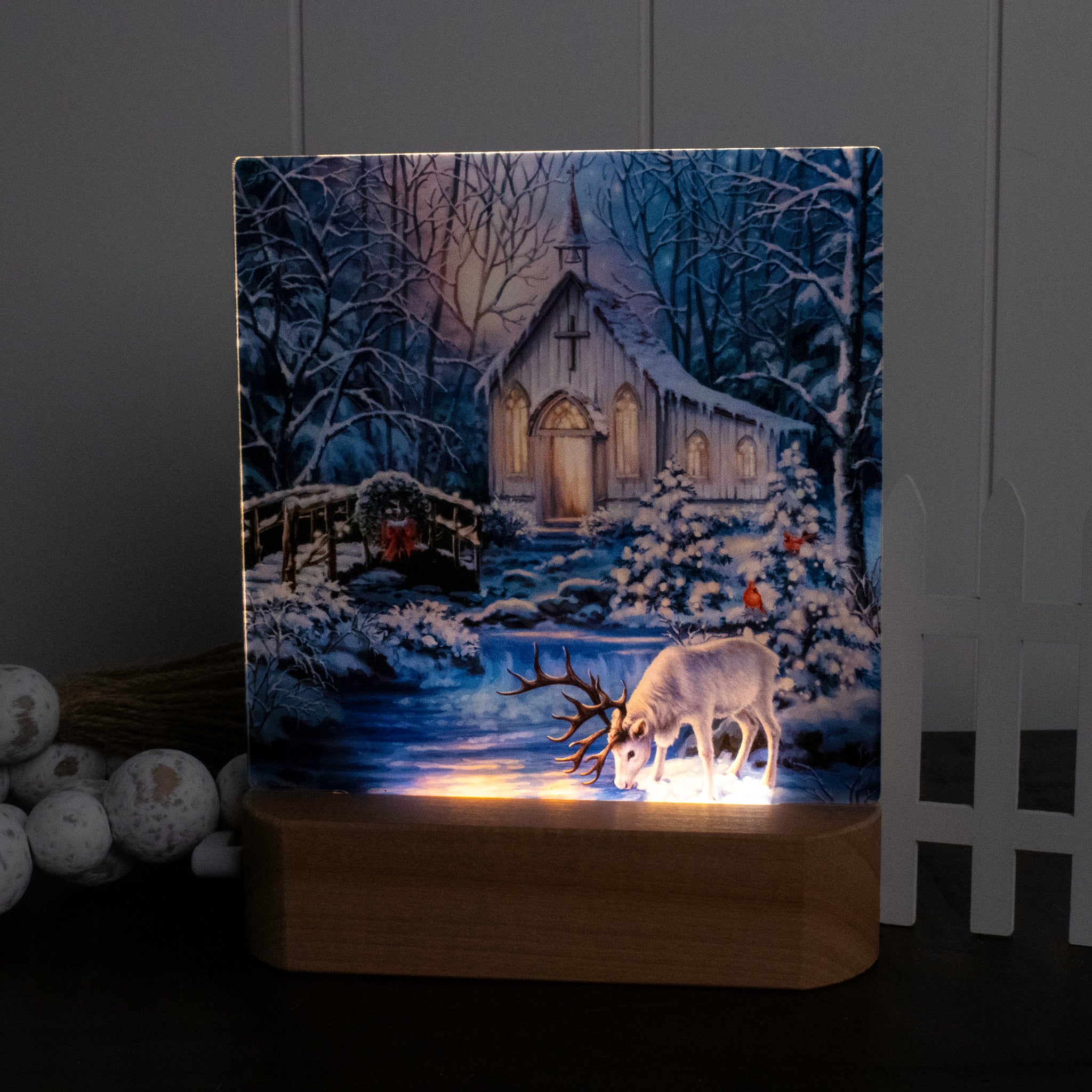 Christmas Prayer captures a peaceful winter night filled with quiet reverence and wonder. Beneath a glowing moon and snow-dusted trees, a small country chapel shines warmly from within, its windows aglow against the stillness of the forest. A gentle stream reflects the soft light, while a graceful deer bows its head nearby, evoking a moment of humility and prayer amid God’s creation. Cardinals perched among the twinkling trees add a familiar symbol of hope and remembrance.