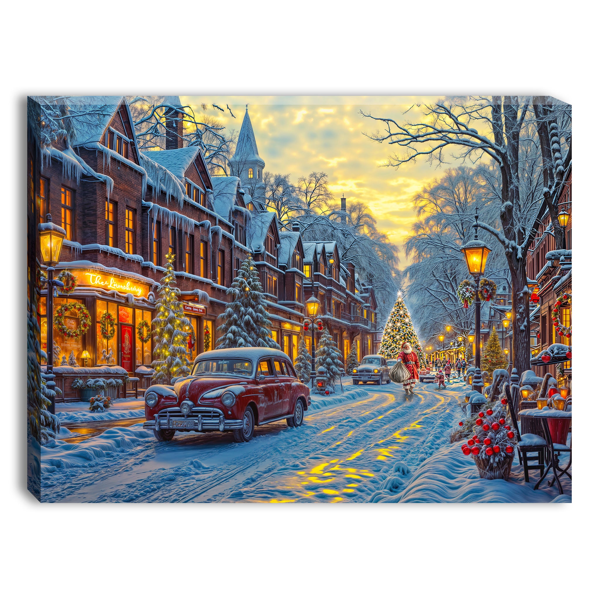 Winter Stroll captures the heartwarming charm of a snowy holiday evening in a cozy small town. Rows of historic brick buildings glow with soft golden light as fresh snow blankets rooftops, trees, and winding streets. A classic red car sits parked along the lane, hinting at nostalgic Christmas memories, while families make their way toward a beautifully decorated tree standing proudly in the town square. Each storefront is adorned with wreaths, garlands, and twinkling accents that add festive warmth to the crisp winter air. The scene feels alive with the magic of the season, inviting you to pause, breathe in the moment, and enjoy the peaceful joy of a Christmas stroll.